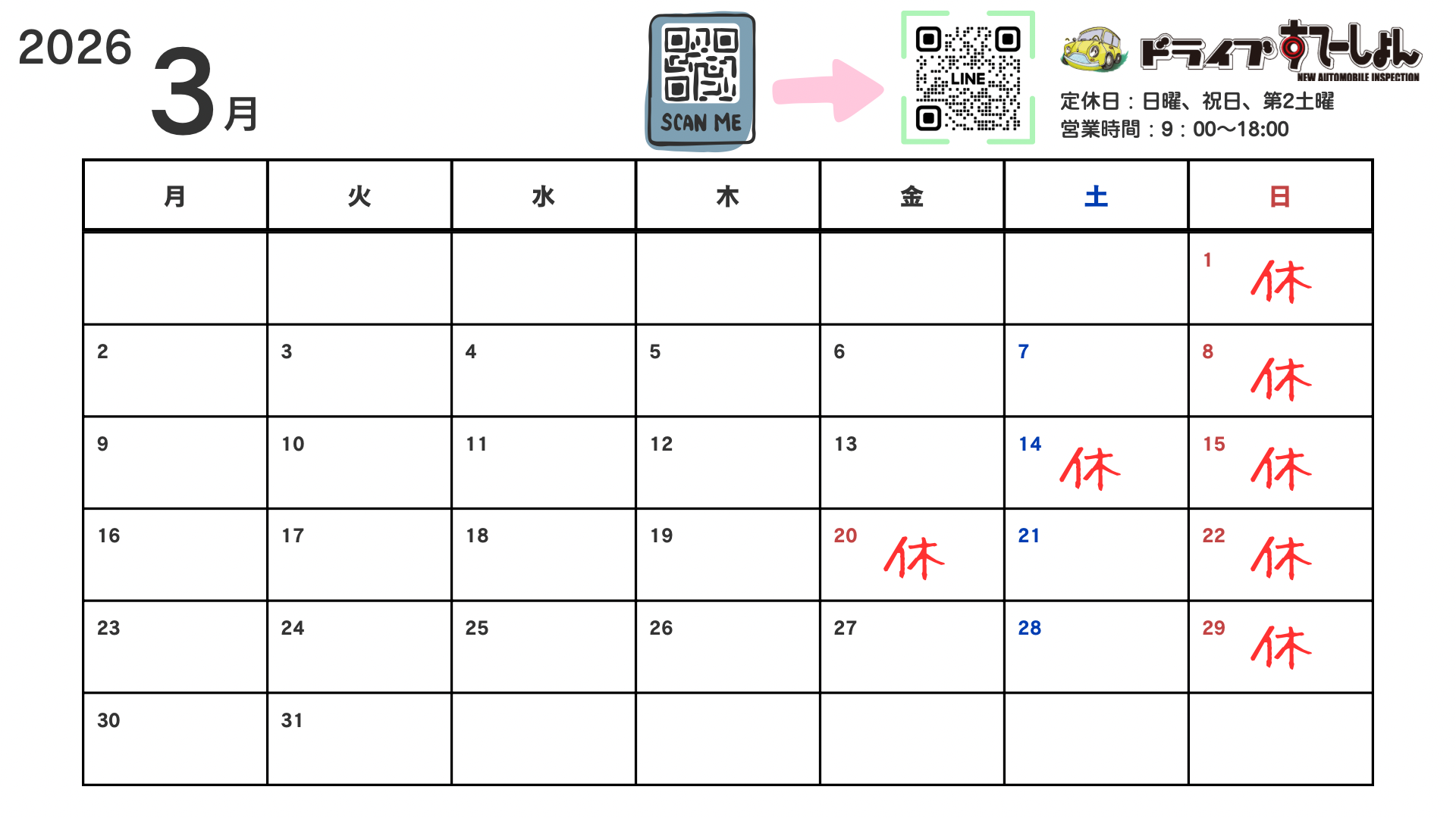 3月の営業カレンダーです。